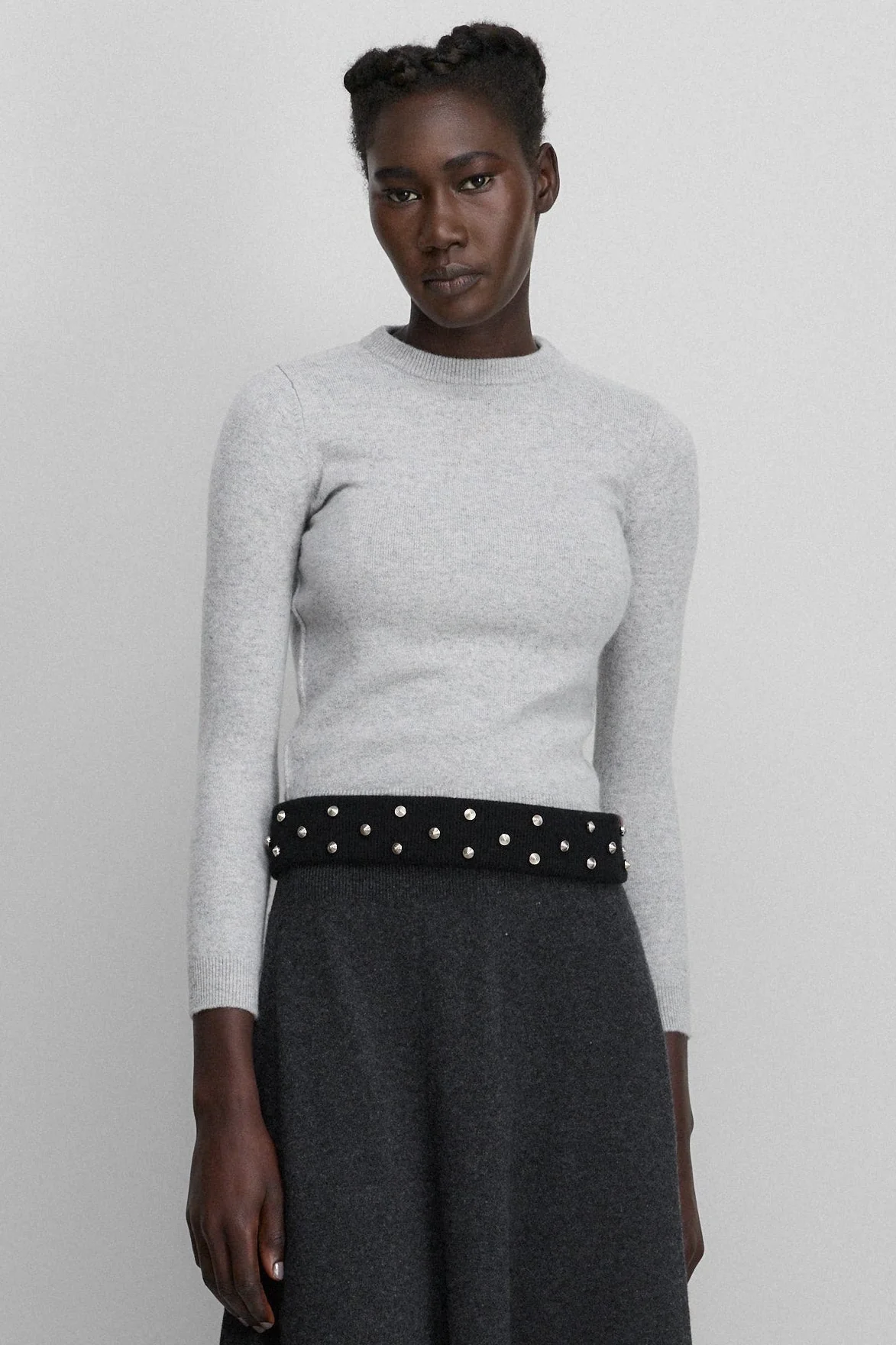this slim-fit and cropped cashmere crewneck sweater named the kid is based on the measurements of a children’s sweater. it’s our most petite style and suitable as a shrunken fit for small bodies. the kid has long sleeves and is rib knitted at the neck, cuffs and hem.